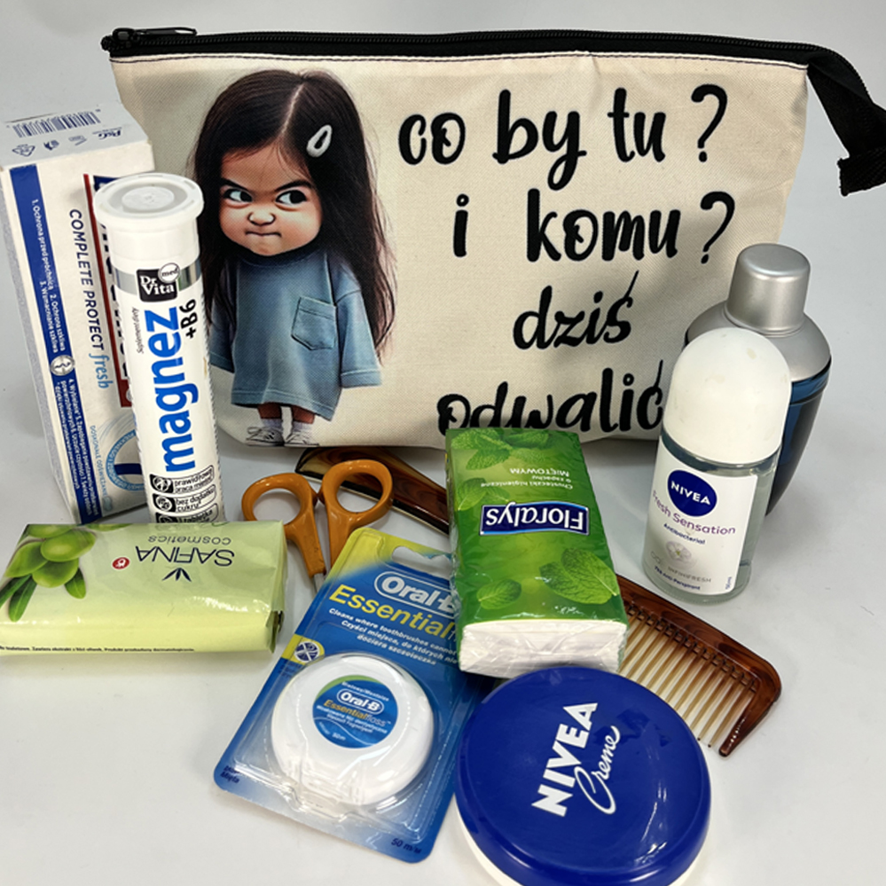 Kosmetyczka z nadrukiem zabawnej, zadziornej dziewczynki i napisem „Co by tu i komu dziś odwalić?”. Świetny gadżet dla osób z charakterem i poczuciem humoru. Niezastąpiona na co dzień i w podróży.