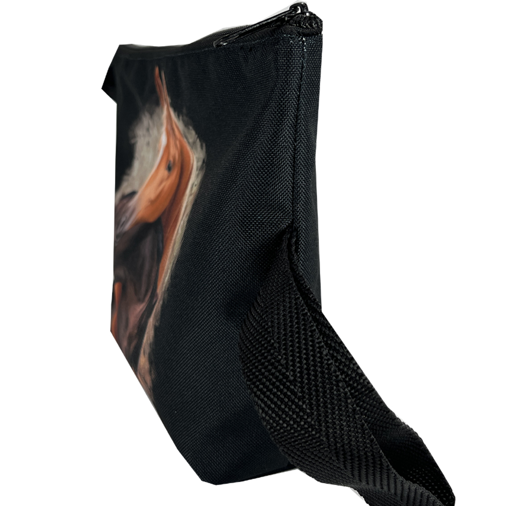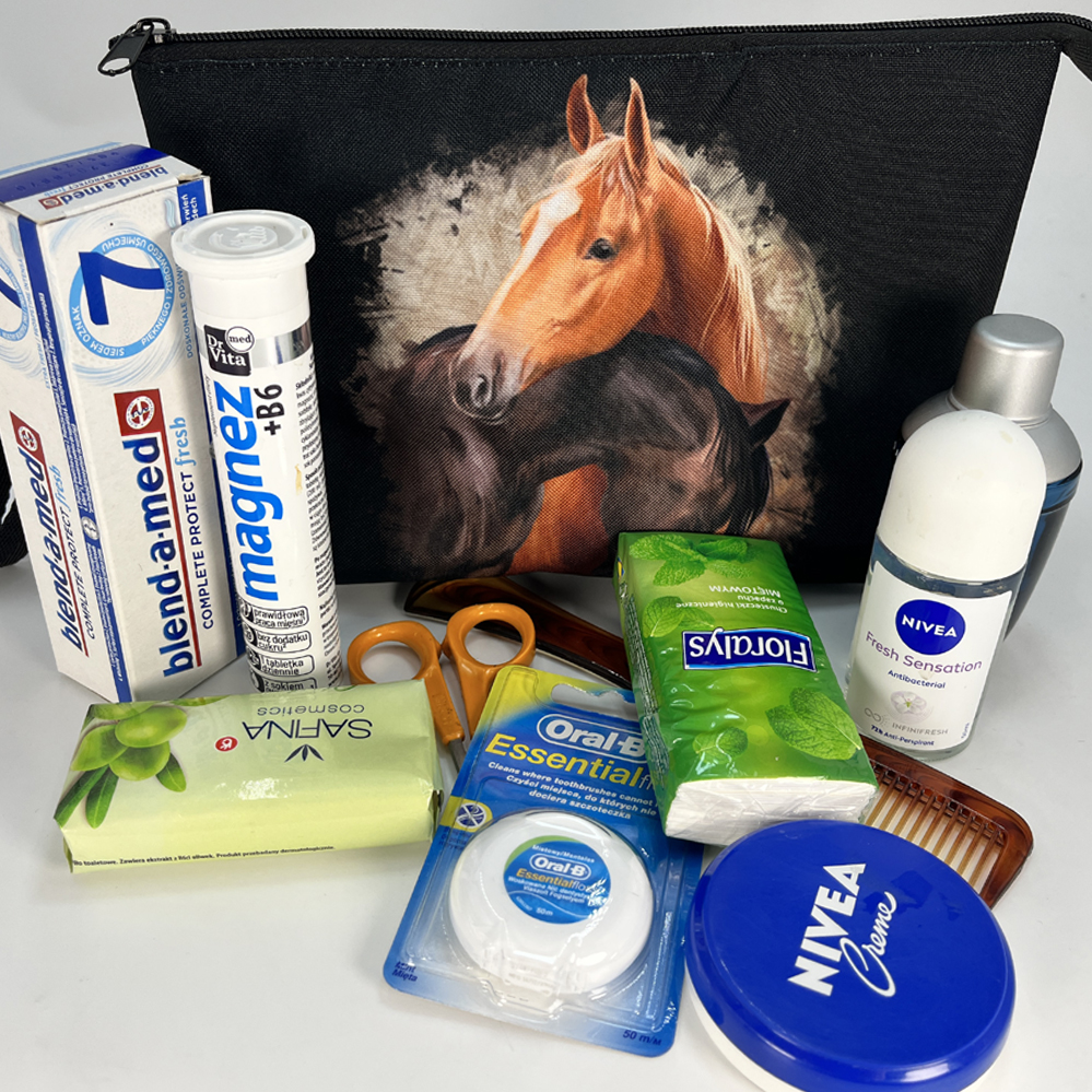 Kosmetyczka z pięknym nadrukiem przedstawiającym dwa konie – świetny wybór dla każdej miłośniczki koni i natury. Praktyczna i pojemna, sprawdzi się zarówno w podróży, jak i do codziennego użytku.